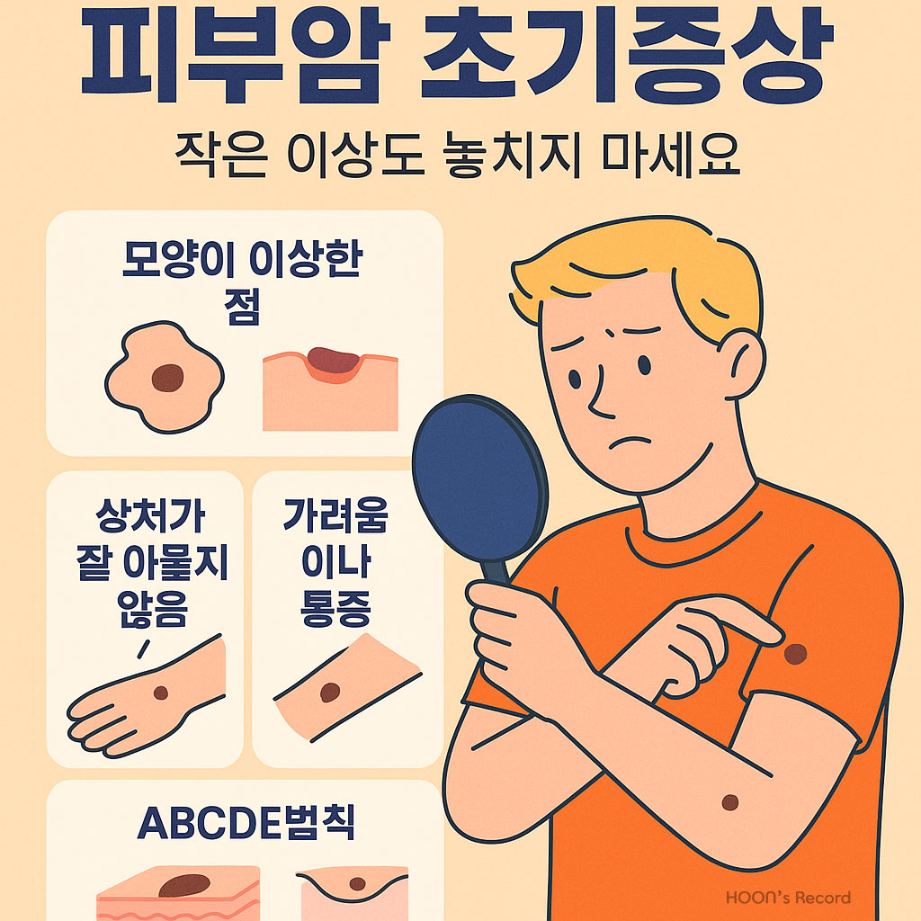 피부암 초기증상, 작은 이상도 놓치지 마세요우리 몸은 늘 무언가를 말하고 있습니다. 피부 또한 마찬가지입니다.햇볕에 오래 노출된 날, 거칠어진 피부를 느낄 수도 있고, 갑자기 생겨난 점이나 상처 하나가 마음에 걸릴 때도 있습니다.그럴 땐 그냥 지나치지 말고 한 번 더 들여다보는 것이 필요합니다.피부암의 초기증상은 매우 미묘하고 작지만, 그 작은 변화가 생명을 지키는 중요한 단서가 될 수 있습니다.이 글에서는 피부암의 주요 초기 증상과 자가진단 방법, 주의해야 할 신호, 그리고 전문 진료가 필요한 경우까지, 검색자의 궁금증을 해소해드릴 수 있도록 정리해보았습니다.피부에 대한 경각심, 오늘 이 글을 통해 함께 가져가 보세요.1. 피부암이란? 조기 발견이 생명입니다피부암은 피부에 생기는 암세포의 비정상적인 증..