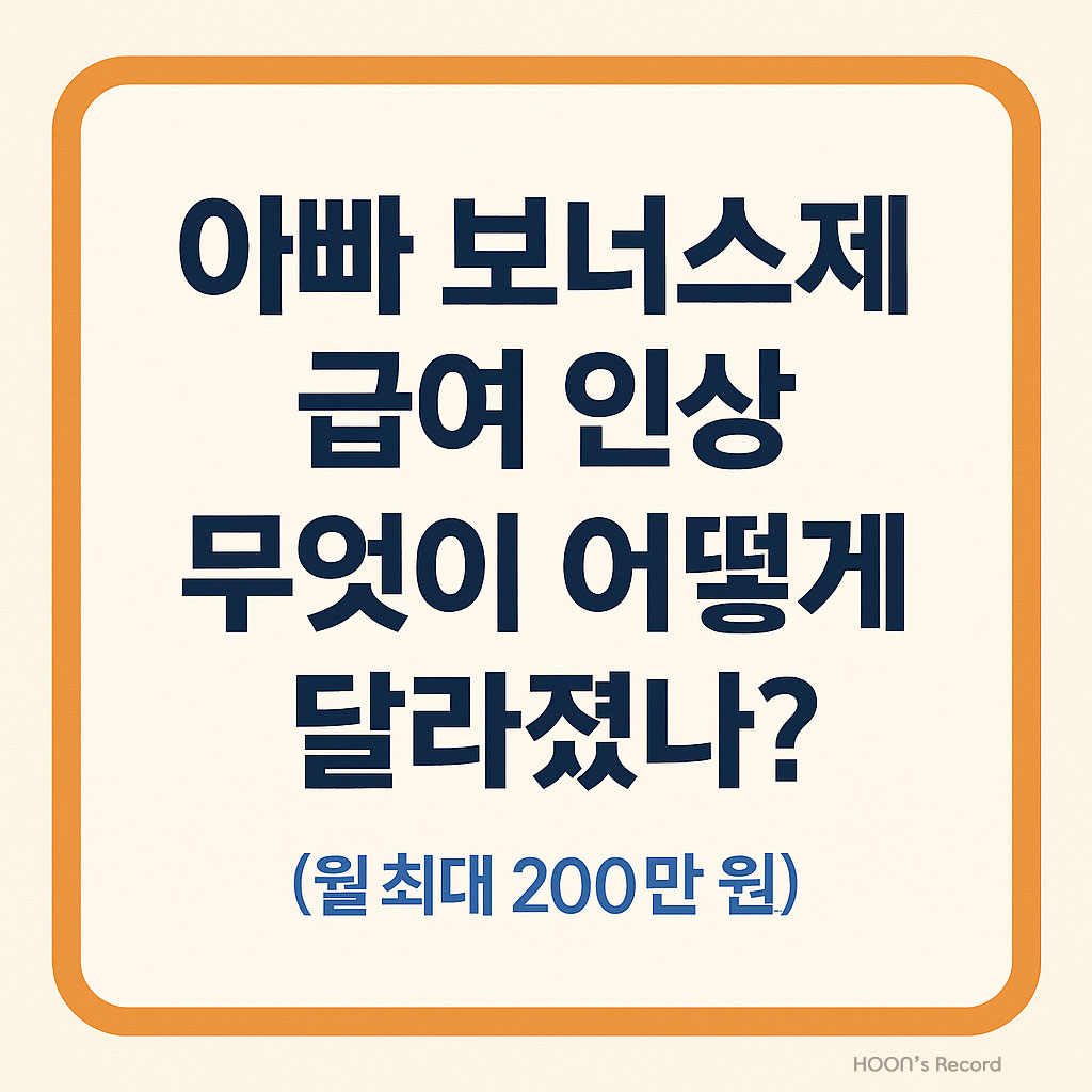 아빠 보너스제 급여 인상, 무엇이 어떻게 달라졌나? (월 최대 200만 원)부모 중 두 번째 육아휴직자에게 적용되던 ‘아빠 보너스제’ 급여가 일반 육아휴직급여와 동일 수준으로 인상되었습니다. 2025년 1월 1일 이후 육아휴직 기간부터 소급 적용되는 핵심 변화와 실수령 예시를 한 번에 정리합니다. ‘맞돌봄’에 힘을 싣는 구조적 보완육아휴직 제도는 ‘사용률’만큼이나 ‘급여 수준’이 실참여를 좌우합니다. 한시 특례였던 아빠 보너스제는 도입 취지와 달리 3개월 이후 급여가 일반 육아휴직보다 낮아지는 역진 문제가 지적돼 왔습니다. 이번 개정은 급여 체계를 일반 육아휴직과 동일 수준으로 끌어올려, 남성의 육아휴직 참여에 실질적 동력을 제공하는 전환점입니다. 블로그 운영 관점에서도 독자의 ‘행동 변화(신청·활용)’..